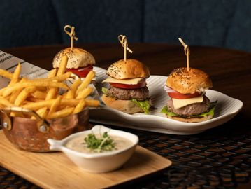 3 mini cheeseburgers con papas fritas. 3 cheeseburger sliders with a side of french fries.