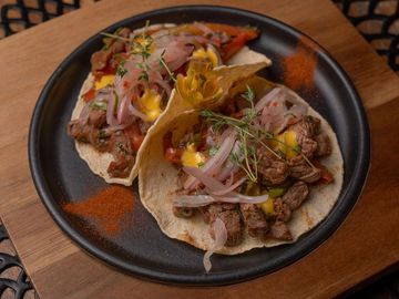 Dos tacos de filete de res, salteado con cebollas, y tomate, salsa crema de aji amarillo y cebolla en vinagre en tortillas de maiz•