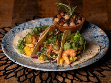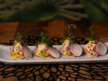 White corn tortilla, raw tuna, avocado, nikkei sauce with soy, lime, Peruvian peppers, sesame, jalapeno.