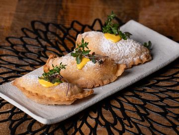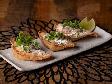 Empanadas filled with beef tenderloin, onions, tomato, soy and oyster sauce stir-fry. Drizzle with lime.