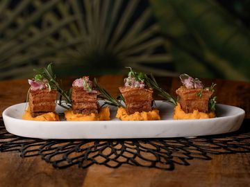 Crispy pork belly served on a bed of batata puree , cilantro and honey.