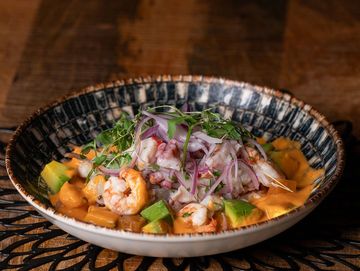 Pescado del día, pulpo y camarones marinado en jugo de limón, salsa de ají rocoto, cebolla roja, cilantro, aguacate. **Ligeramente picante •