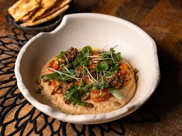 Hummus tradicional con berenjena y tomates asados, zaatar, reducción de balsámico, aceite de oliva extra virgen, rúcula, pimienta y cúrcuma, servido con casabe tostado con aceite de coco y ajos •