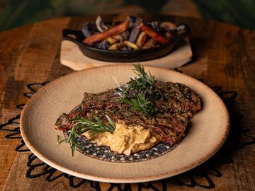 Churrasco Angus 12oz con pure de coliflor y papas fritas moradas