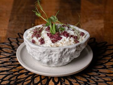 Traditional hummus with eggplant, roasted tomatoes, zaatar, balsamic reduction, extra virgin olive oil, arugula, pepper and turmeric served with toasted casabe in coconut oil and garlic