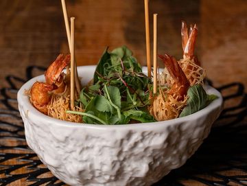 Camarones fritos envueltos en phyllo desmenuzado, mango, salsa chipotle, togarashi, rúcula, albahaca •