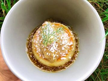 Con salsa de especias orientales, puré de batata a la naranja, cilantro y miel •