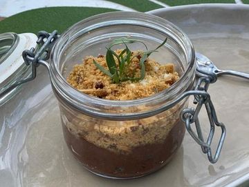 Chocolate oscuro con pure de aguacate cubierto de almendras crujientes • dark chocolate mousse infused with avocado, topped with crunchy almonds